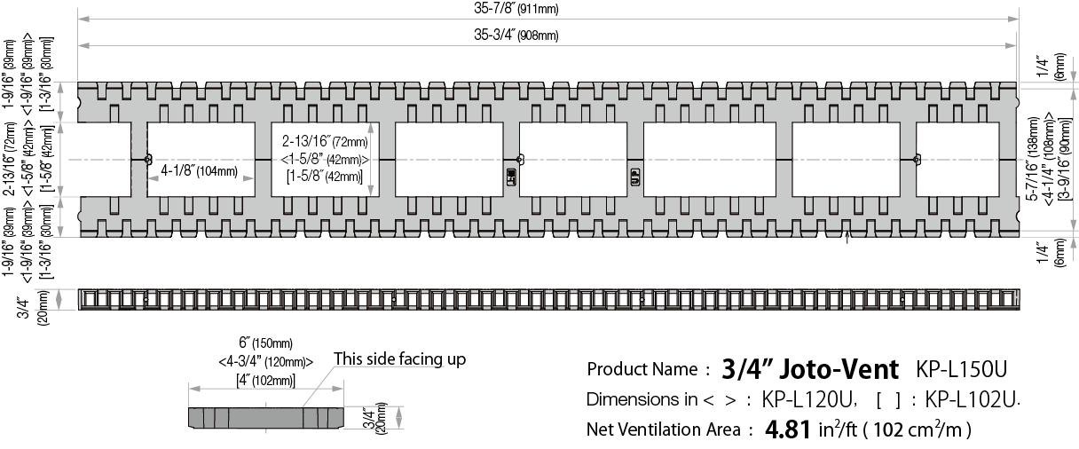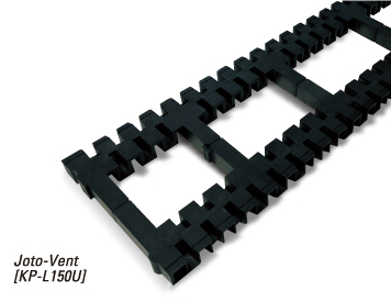 The Joto-Vent is made by molding a composite material (JC) from calcium carbonate and polyolefin resin. This 1x6 Joto-Vent "KP-L150U" is for 2 x 6 and 2 x 8 stud walls. The net-free ventilation opening area is 14.43 sq.in/pc (4.81 sq.in/ft).