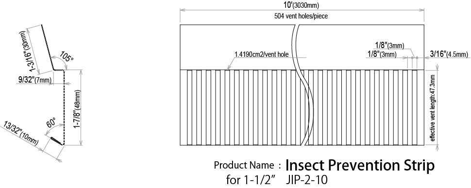 The Joto-Vent Insect Prevention Strip is a galvanized steel plate conforming to ASTM A792 called “galvalume”. It has a minimum opening of 1/8 inch, which provides efficient underfloor ventilation while also providing an insect prevention. By combining with Z-Covering with smaller protruding dimensions (sold separately), it can minimize the impact on the aesthetic appearance while preventing deterioration of the bottom edge of the siding. This Insect Prevention Strip is ICC-ES approved.