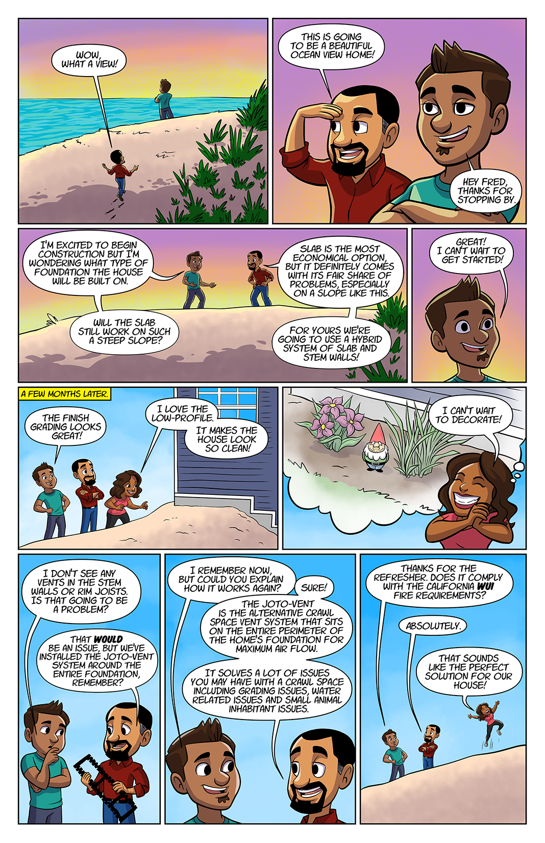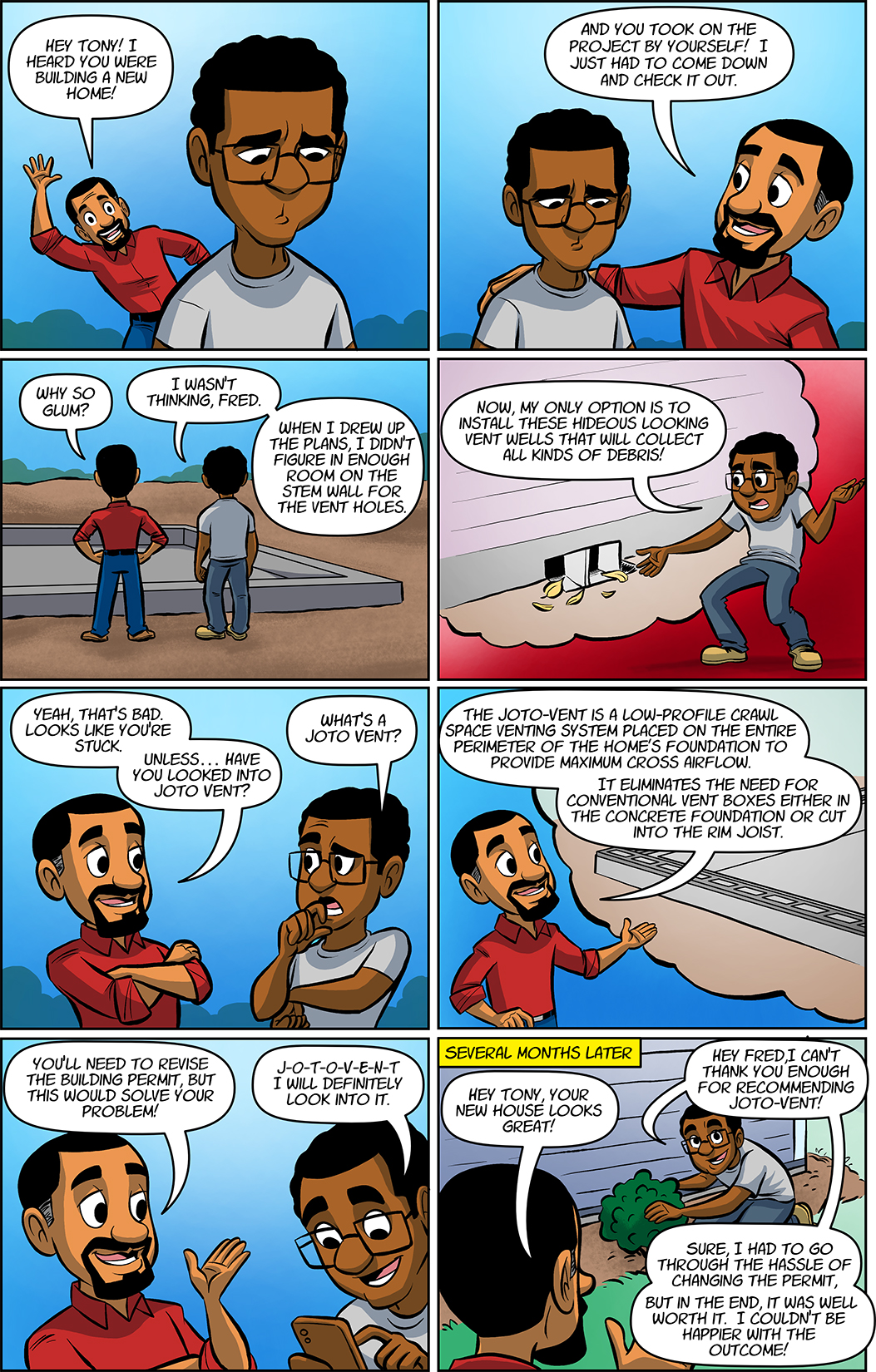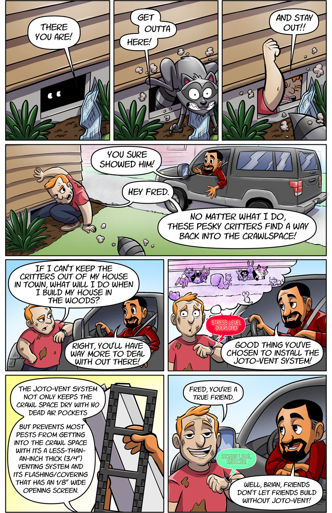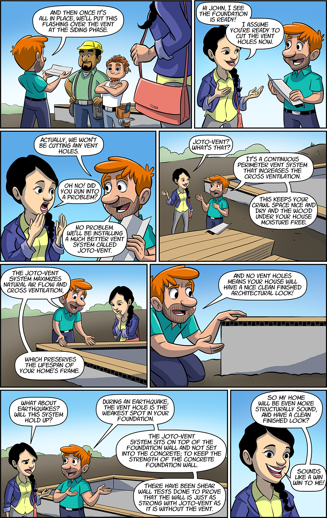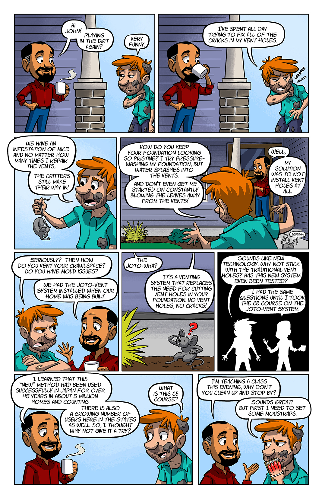 Here are some of the comic strips that we have created to help our customers learn about our crawlspace ventilation system. Feel free to contact us with any questions you may have or feedback on the comic strips.